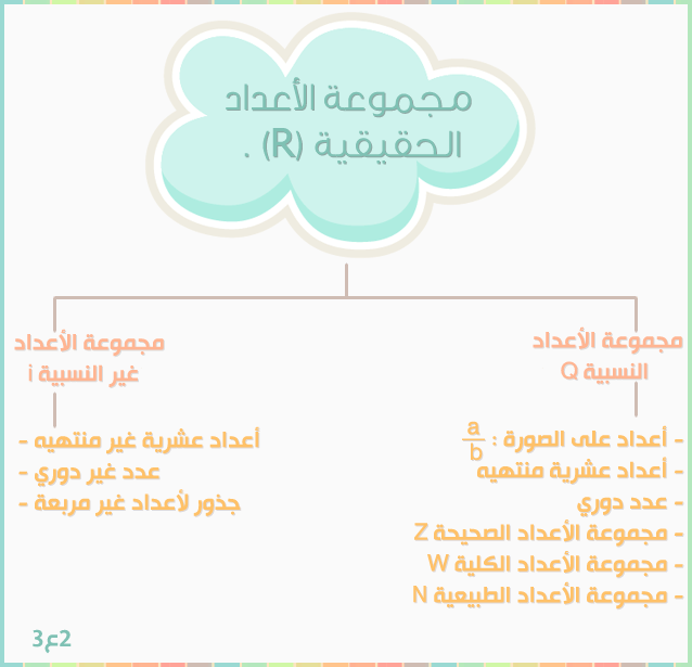 الأعداد غير النسبية: تتضمن الكسور العشرية الدورية غير المنتظمة، والجذور التي ليس لها مربعات، أو مكعبات كاملة مثل: ……0.121221222، 3√، π.
